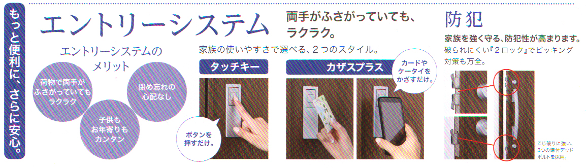 もっと便利に、さらに安心。エントリーシステム,両手がふさがっていてもラクラク。 エントリーシステムのメリット「荷物で両手がふさがっていてもラクラク」「子供もお年寄りもカンタン」「閉め忘れの心配なし」,家族の使いやすさで選べる、2つのスタイル。タッチキー(ボタンを押すだけ),カザスプラス(カードやケータイをかざすだけ)