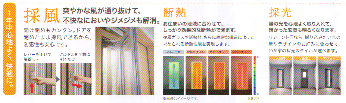 一年中心地よく、快適に。採風,爽やかな風が通り抜けて、不快なにおいやジメジメも解消。開け閉めもカンタン。ドアを閉めたまま採風できるから、防犯性も安心です。レバーをあげて解錠し、ハンドルを手前に引くだけ,断熱,お住まいの地域に合わせて、しっかり効果的な断熱ができます。複層ガラスや断熱材、さらに綿密な構造によって、求められる断熱性能を実現します。