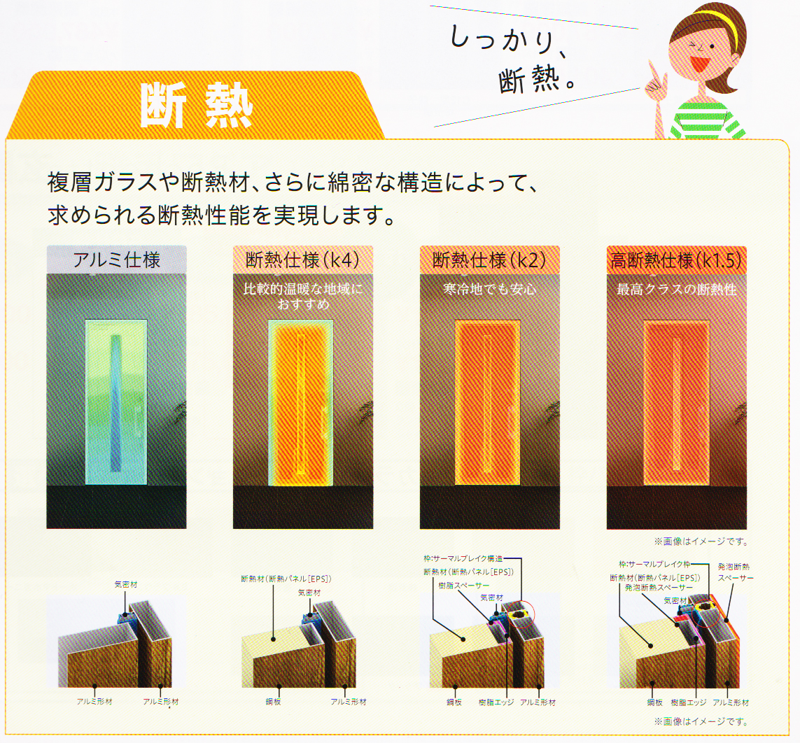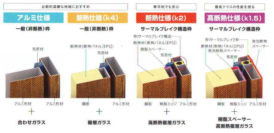 「アルミ使用」「断熱仕様(k4)」「断熱仕様(k2)」「高断熱仕様(k1.5)」