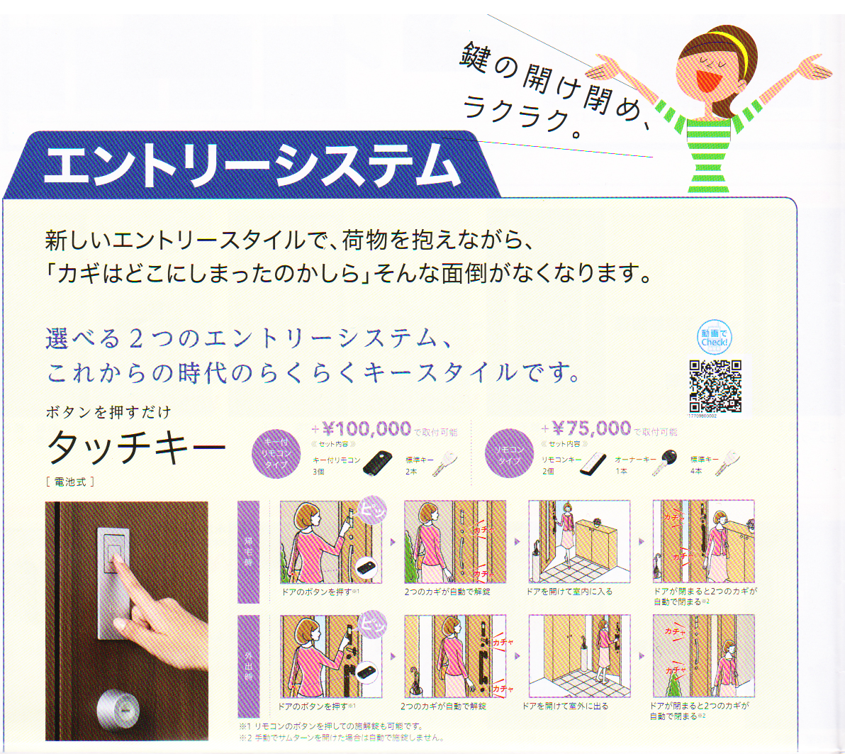 ボタンを押すだけ「タッチキー」キー付リモコンタイプも選べます。リモコンの中にカギを収納できます。,カードやケータイをかざすだけ。「カザスプラス」