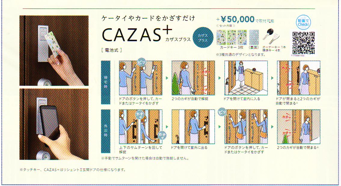 ケータイやカードをかざすだけ「CAZAS+カザスプラス」+\50,000で取付可能 セット内容:カードキー3枚※三種類共通のデザインとなります。、オーナーキー1本、標準キー4本