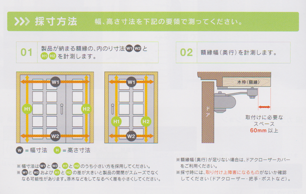 01製品が納まる額縁の、内のり寸法W1・W2とH1・H2を計測します。W=幅寸法、H=高さ寸法 02額縁幅(奥行)を計測します。
